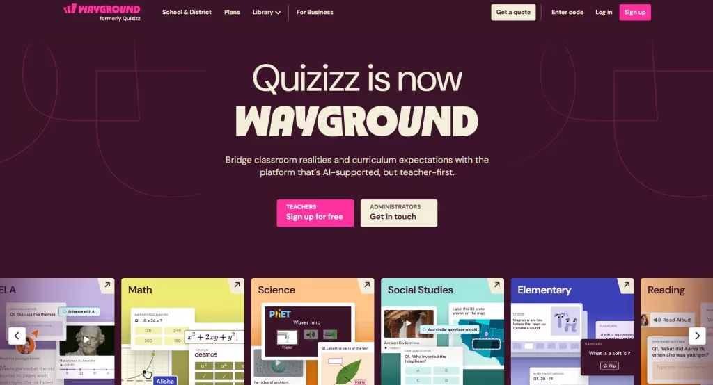Quizizz allows you to build interactive lectures and quizzes – these adjust to what each student can do. The AI changes the difficulty – it rephrases questions to help people understand them. It also suggests real situations.
